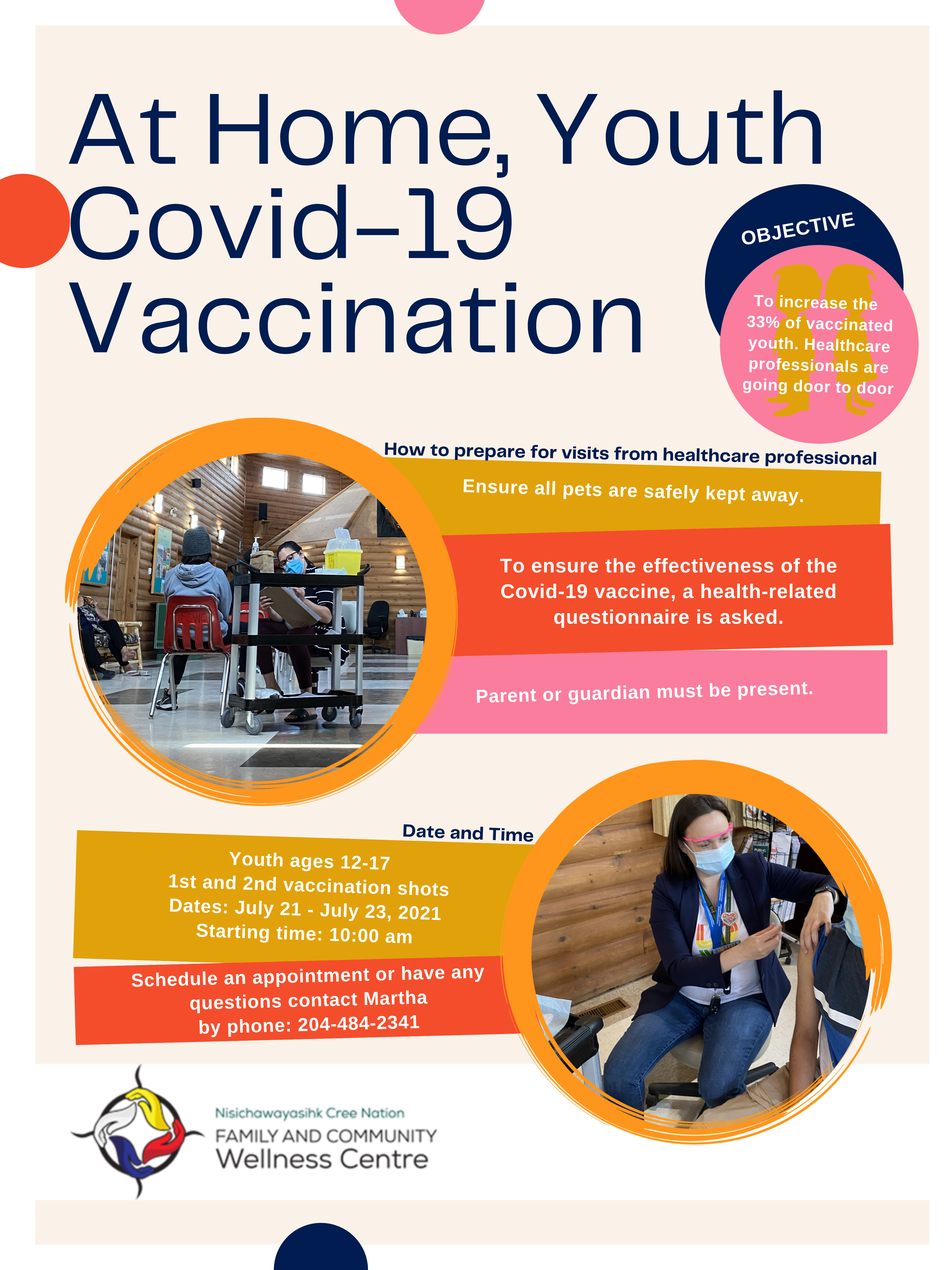 Family and Community Wellness Centre will be out in the community, door-to-door, to increase youth vaccinated. It is essential to get vaccinated to keep our community safe from covid-19, and with many stores and establishments opening up with the restrictions of having their patrons being double vaccinated.