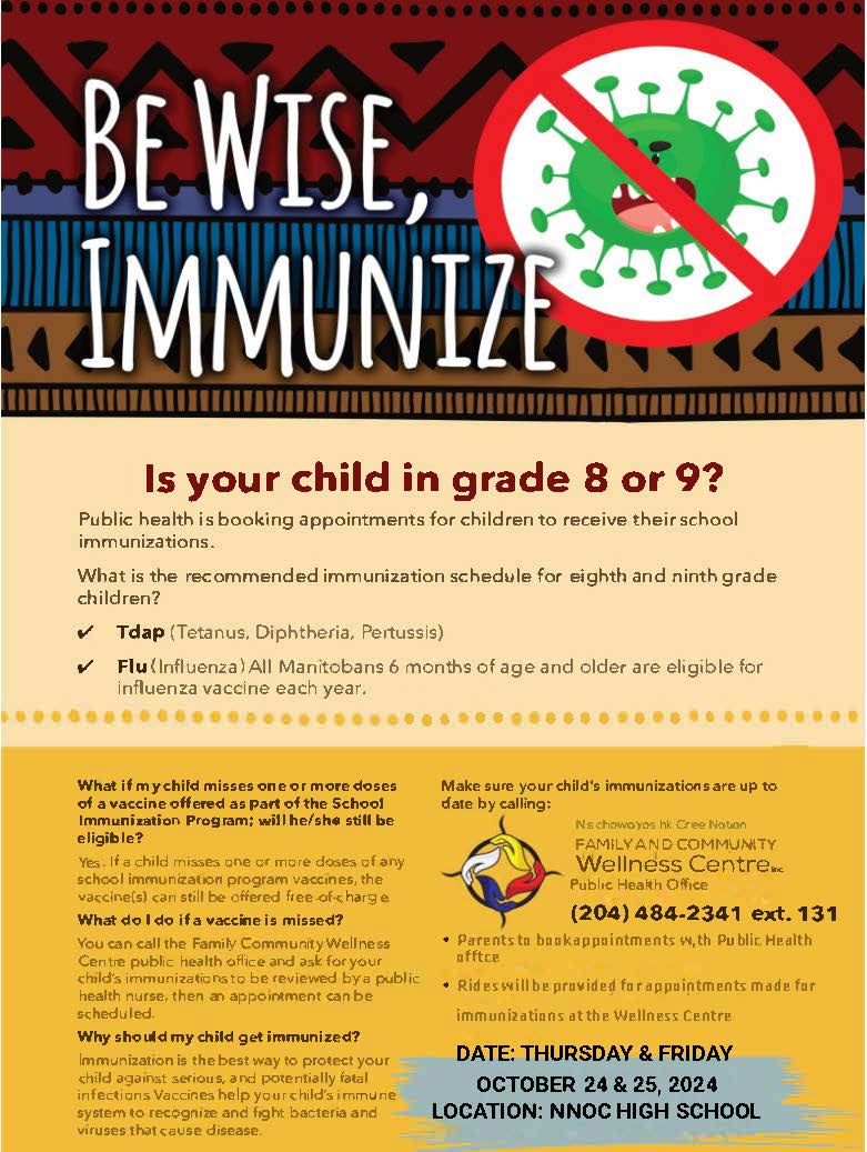 If you are a parent or legal guardian for children in Grade 6, 8, or 9, please call a Public Health Nurse at 204-484-2341 or stop by the Wellness Centre at to provide consent for your child’s immunizations.